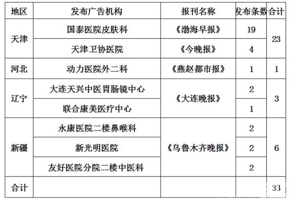 其中天津發(fā)布虛假違法中醫(yī)醫(yī)療廣告情況較為嚴(yán)重,國(guó)泰醫(yī)院皮膚科在《渤海早報(bào)》發(fā)布19條次,天津衛(wèi)協(xié)醫(yī)院在《今晚報(bào)》發(fā)布4條次。河北省的動(dòng)力醫(yī)院外二科在《燕趙都市報(bào)》發(fā)布1條次。遼寧省的大連天興中醫(yī)胃腸鏡中心和聯(lián)合康美醫(yī)療中心在《大連晚報(bào)》分別發(fā)布2條次、1條次。新疆維吾爾自治區(qū)的永康醫(yī)院二樓鼻喉科、新光明醫(yī)院、友好醫(yī)院分院二樓中醫(yī)科在《烏魯木齊晚報(bào)》各發(fā)布2條次。具體名單見(jiàn)下: